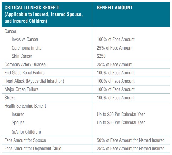 - Family Coverage (Spouse up to 50% of insured – max of $50,000; Child(ren) options: $5,000 or $10,000)